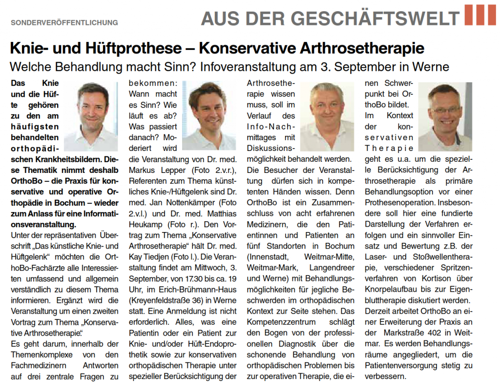 Das Knie und die Hüfte gehören zu den am häufigsten behandelten orthopädischen Krankheitsbildern. Diese Thematik nimmt deshalb OrthoBo – die Praxis für konservative und operative Orthopädie in Bochum – wieder zum Anlass für eine Informationsveranstaltung.